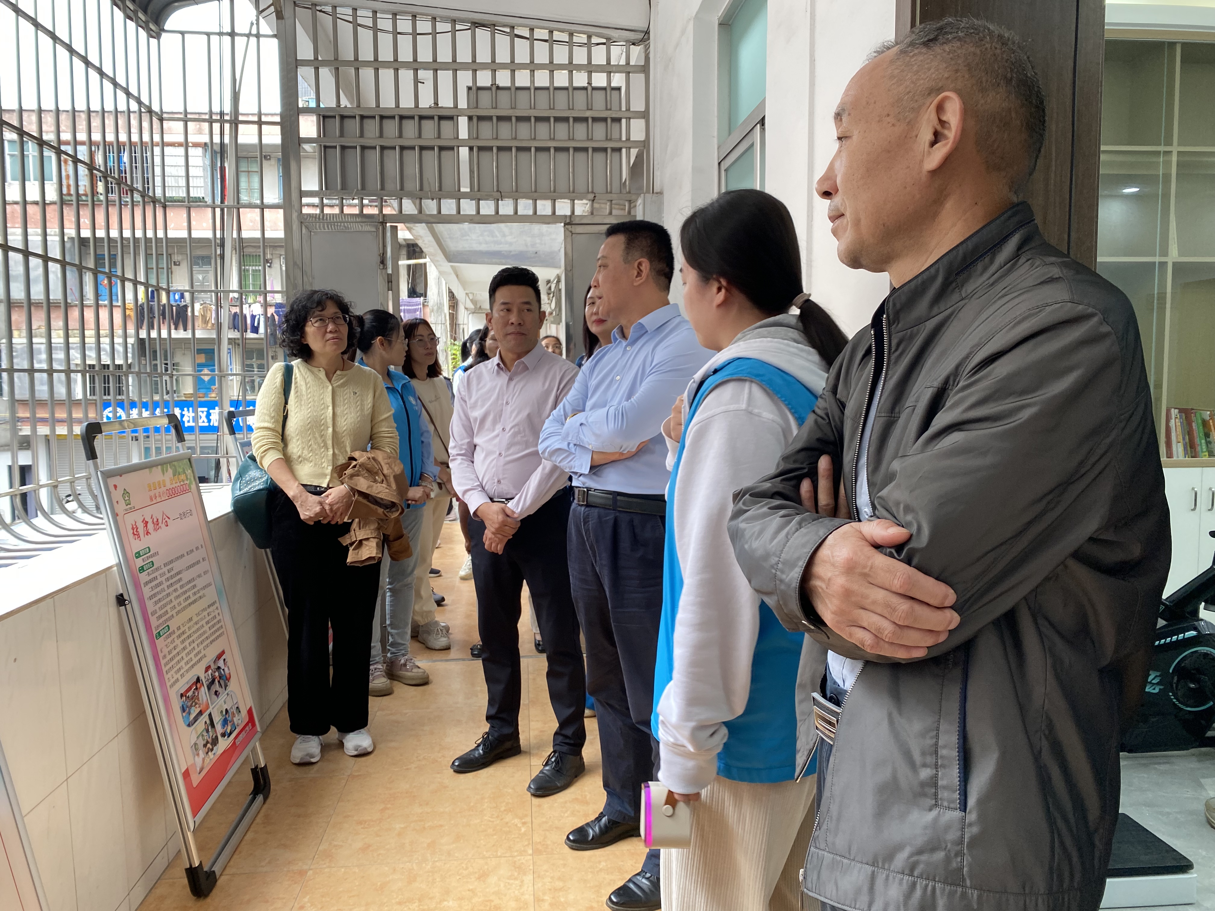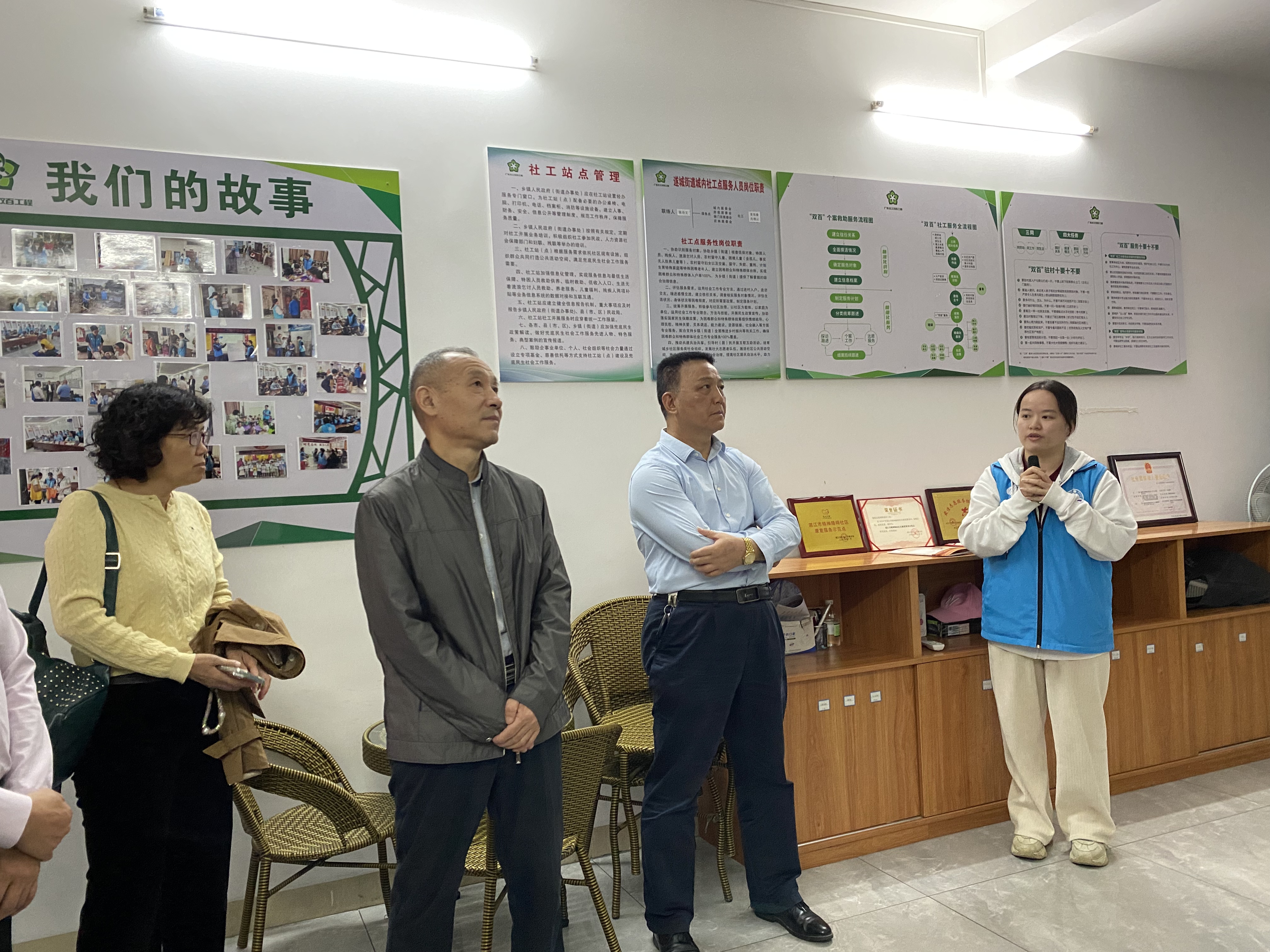 陳觀光一行人首先來到遂城街道社工站城內社工點進行參觀交流。社工點聯絡員陳詩文詳細介紹了站點建設、服務開展及社區融入情況,展示了遂城街道在基層社工服務陣地標準化、服務項目化方面的探索與實踐。