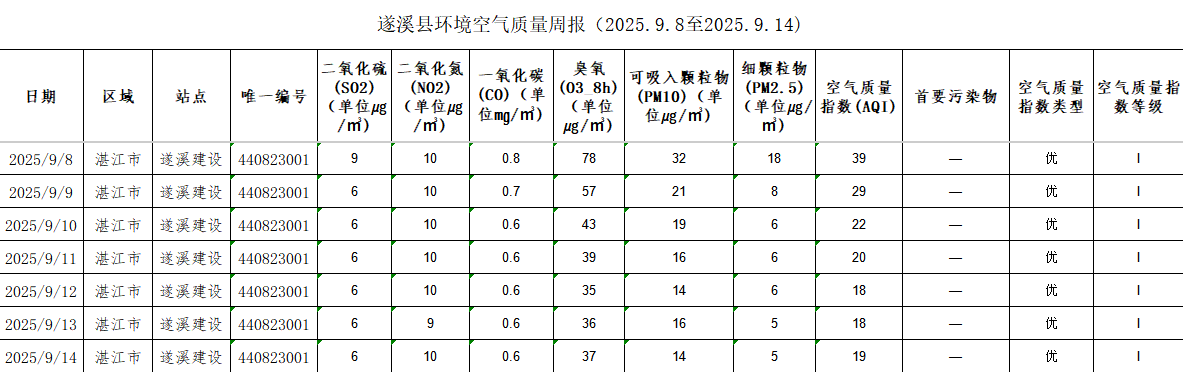 遂溪縣環境空氣質量周報(2025.9.8至2025.9.14)