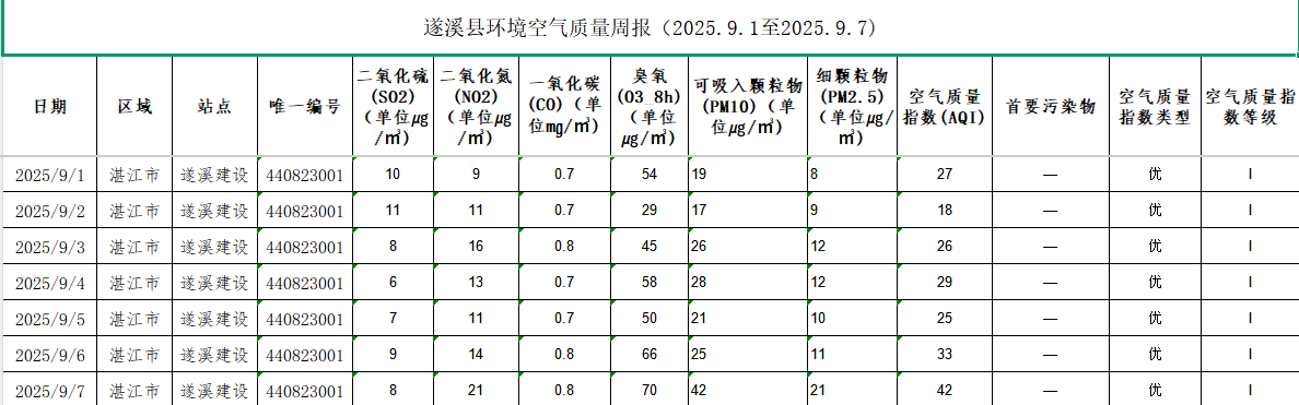 遂溪縣環境空氣質量周報(2025.9.1至2025.9.7)