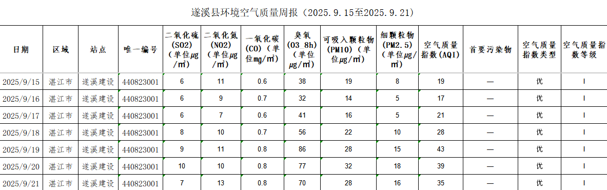 遂溪縣環(huán)境空氣質(zhì)量周報(2025.9.15至2025.9.21)