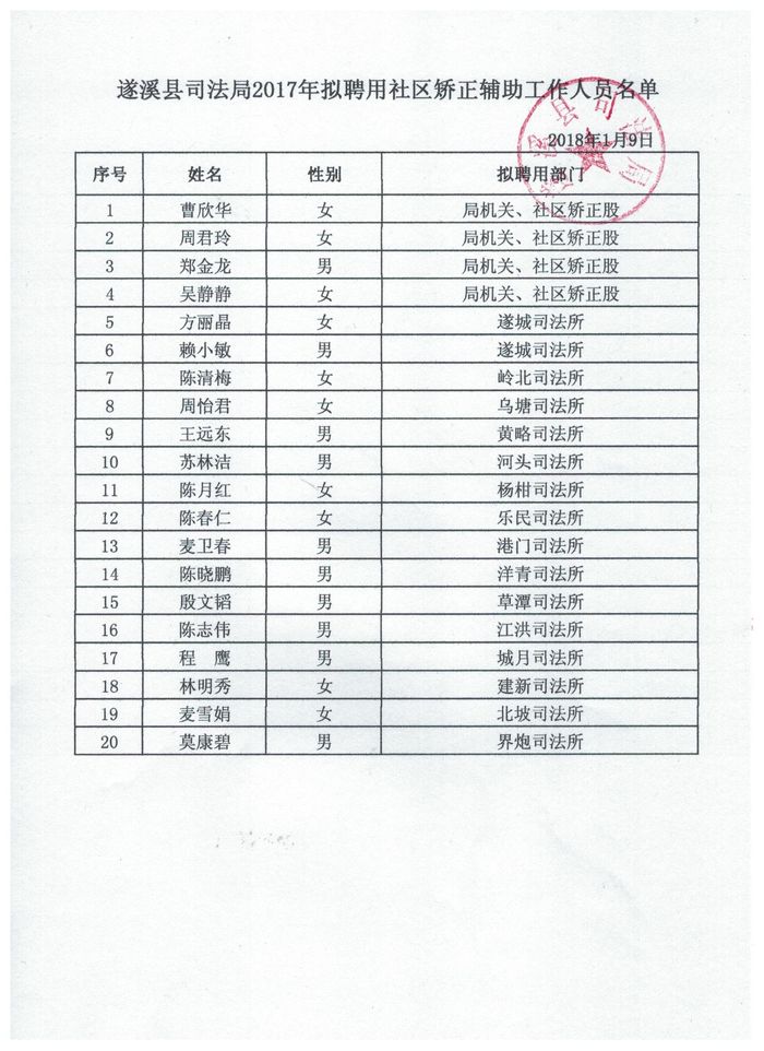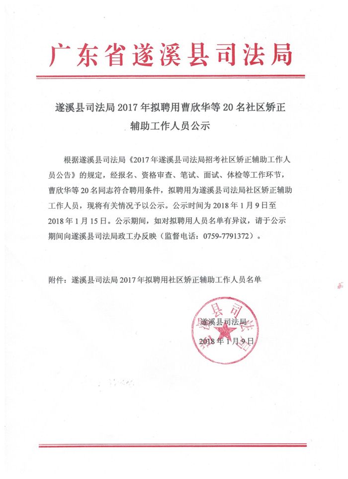 遂溪縣司法局2017年擬聘用曹欣華等20名社區矯正輔助工作人員公示