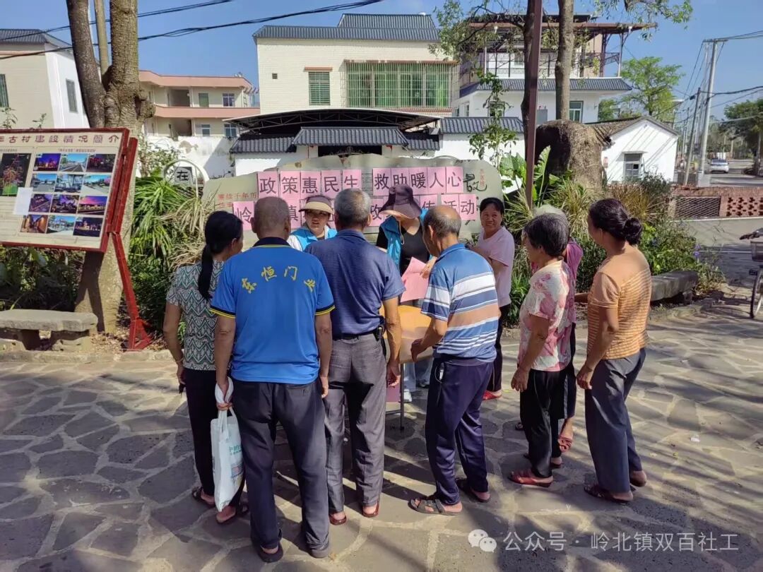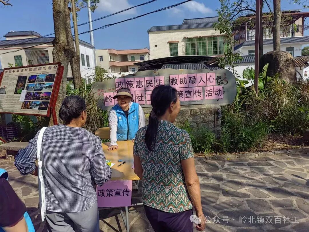 為進一步提升社會救助政策的知曉度,切實保障困難群眾的基本權益,2025年10月17日上午,嶺北鎮社工站在調豐村小公園開展“政策惠民生 救助暖人心”政策宣傳活動。活動現場通過政策宣傳、有獎問答、果蔬套圈等形式,向群眾普及最低生活保障、特困人員供養、臨時救助、防詐騙等惠民政策,確保救助政策“接地氣、入人心、見實效”。