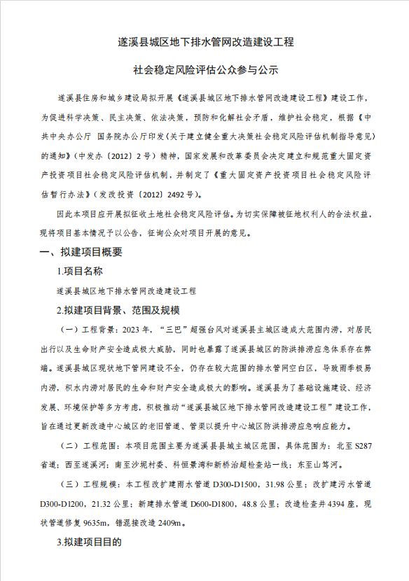 遂溪縣城區地下排水管網改造建設工程社會穩定風險評估公眾參與公示 | | 作者: | 來源:本網 | 時間:2025-10-31 17:48:48 點擊數:- 附件:遂溪縣發展和改革局關于遂溪縣城區地下排水管網改造建設工程可行性研究報告的批復.pdf 【打印正文】