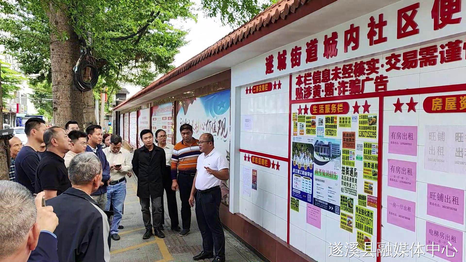 與會人員實地參觀了遂城街道城內社區便民宣傳廣告欄,學習該社區在小廣告整治工作經驗。據介紹,遂城街道城內社區的便民宣傳廣告欄已形成規范管理模式,設有生活服務、房屋資產、二手交易、求職招聘、公益宣傳、緊急服務等分類欄目。自今年6月建成以來,已有許多市民和商戶按照要求在此張貼廣告,有效治理了亂張貼的難題,改善了社區環境。