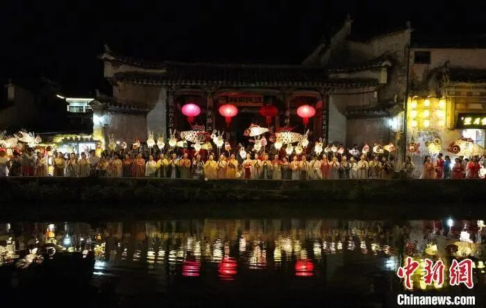 資料圖:安徽省黃山市黟縣宏村舉行“花燈邀明月 歡樂度中秋”花燈游園會,人們舞動繽紛多彩的花燈漫步在古村中,邂逅良辰美景,在燈火月影中感受傳統文化魅力,喜迎中秋佳節。(無人機照片)施亞磊 攝