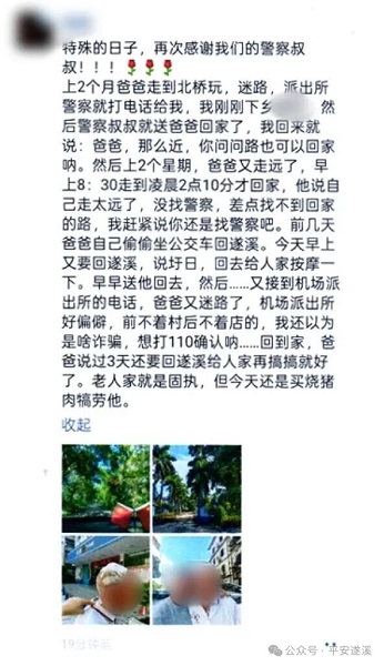 不久,老人的家屬林女士急匆匆趕到派出所,見到老人平安無恙后非常高興,對民警的及時救助連連感謝,隨后還在其微信朋友圈發文感謝民警。9月4日,林女士通過“局長信箱”寫來感謝信贊揚機場派出所民輔警熱心助民。
