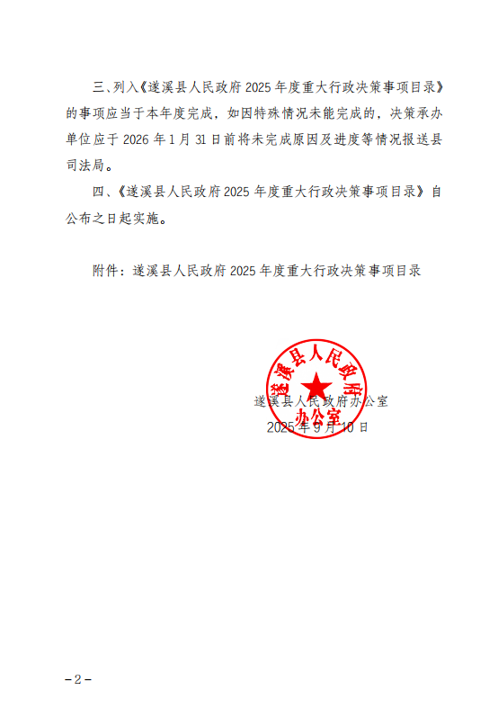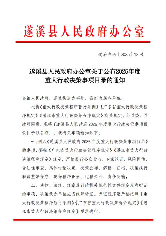 遂溪縣人民政府辦公室關于公布2025年度重大行政決策事項目錄的通知