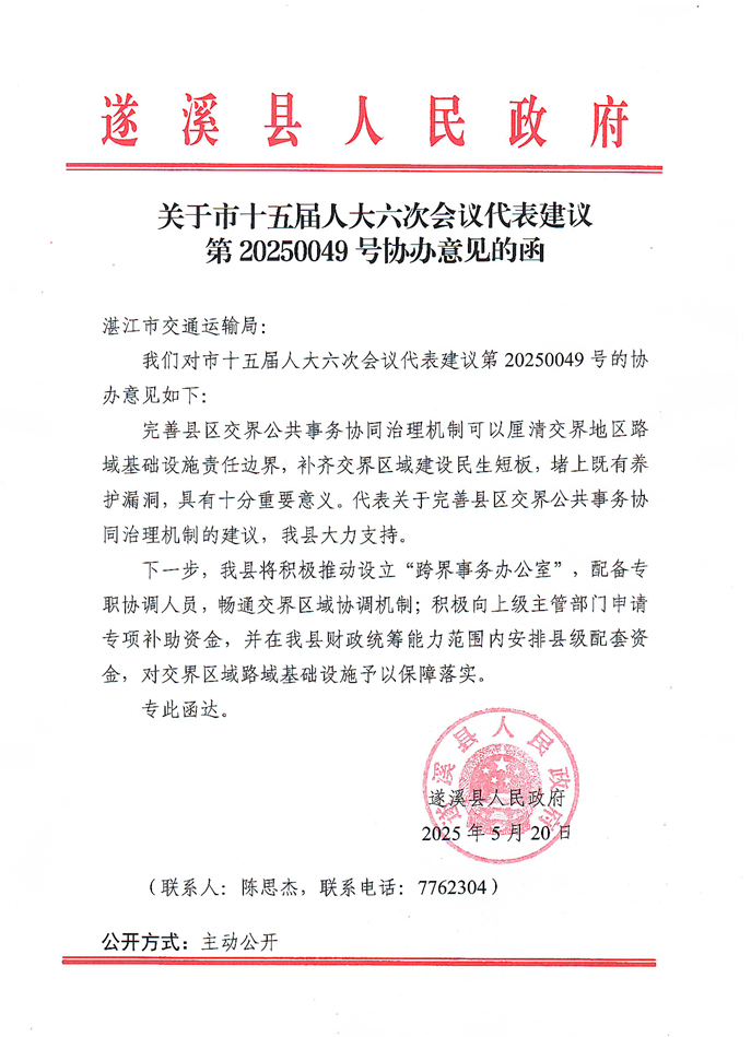 關(guān)于市十五屆人大六次會議代表建議第20250049號協(xié)辦意見的函